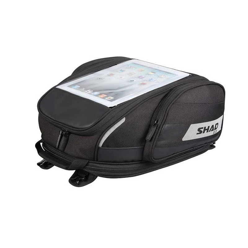 X0SL20F Bolsa de sobre deposito marca Shad. Fijación a la moto por medio de correas que van a chasis o estriberas, y a manillar (incluidas), forro impermeable para lluvia.