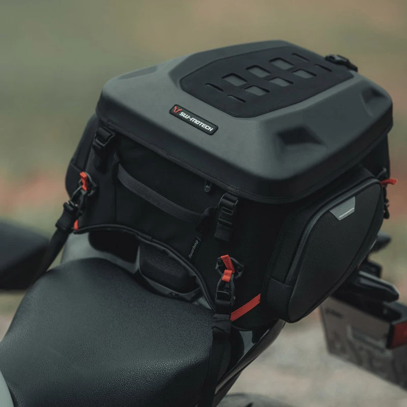 Bolsa trasera PRO Rearbag con un volumen ampliable de 22 a 34 litros se adapta perfectamente a motos de carretera y trail.
