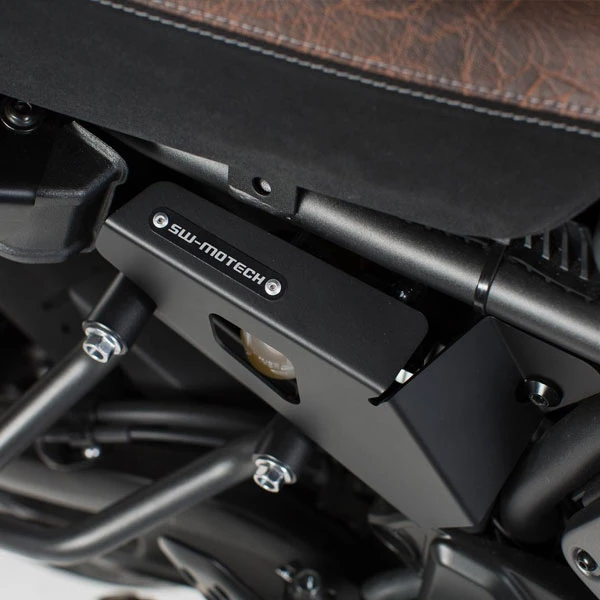 Los accesorios de SW-MOTECH son compatibles con el aspecto clásico de esta moto retro. Las cubiertas de los marcos, montadas en ambos lados, protegen el depósito de líquido de frenos y sirven como elementos de diseño.