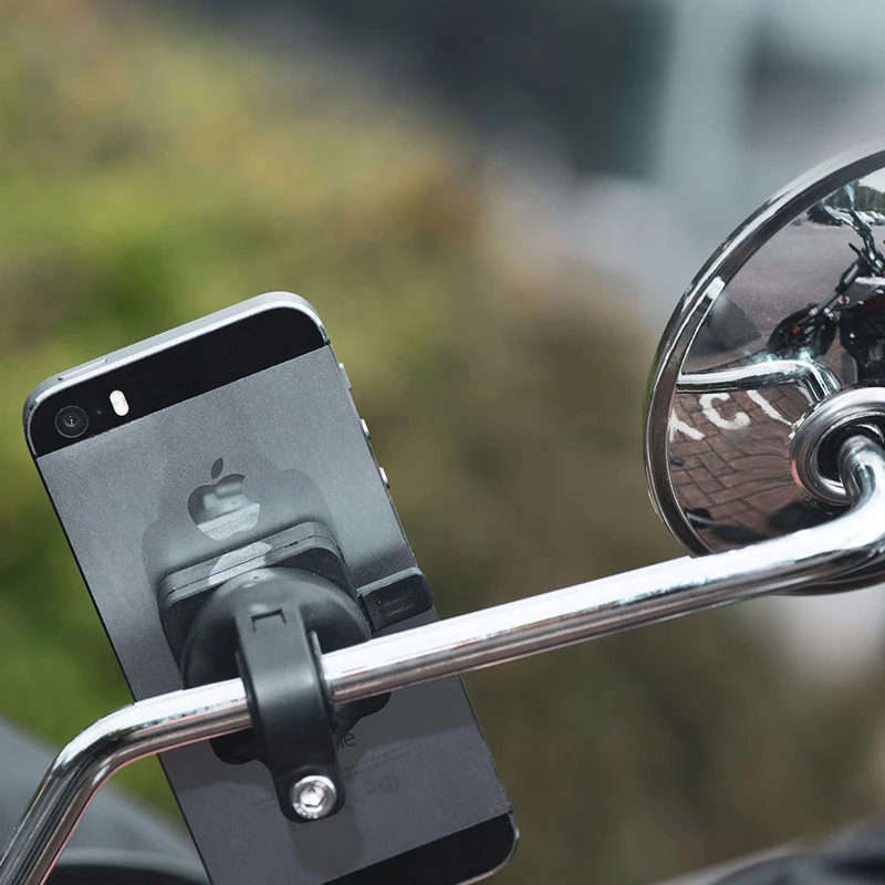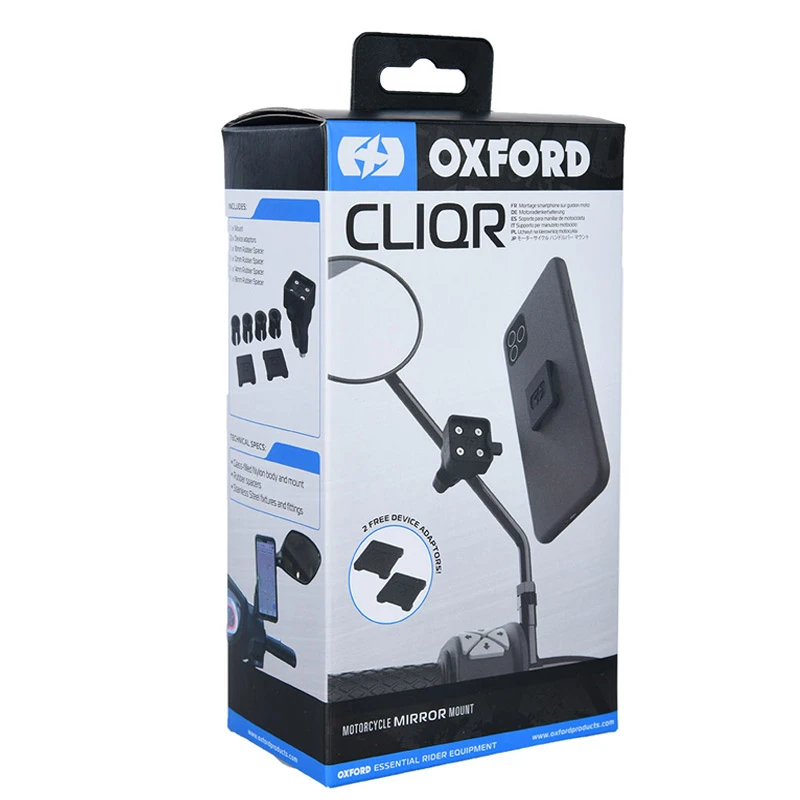 Soporte CLIQR para espejo de la marca Oxford que incluye varios adaptadores para poder ajustar como más convenga. Tu móvil a la vista sujeto en el espejo de la moto